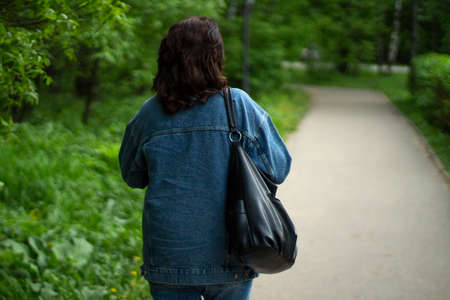 A woman walks through the park. Girl with a black bag and denim jacket. A woman walks down the street.