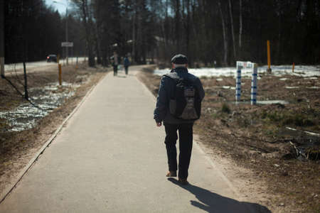A man walks down the road in the park. A person in Russia steps to work. A simple citizen.