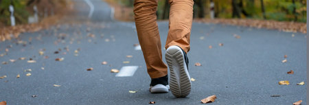 Man going along road, closeup of legs