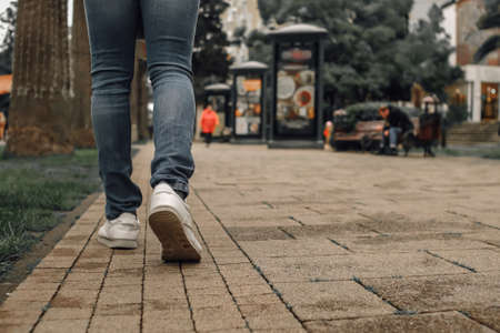 A woman in jeans walks through the narrow streets of the city. Cropped photo back view of legs. Brick walls around the pedestrian alley. Close up of person walking on paving stone street