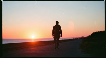 Man walking along a scenic path at sunset on a calm evening