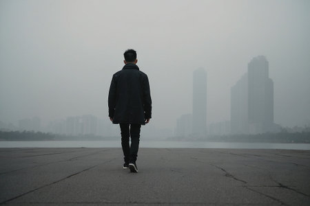 Man walking on the street in a foggy day in Shanghai, China