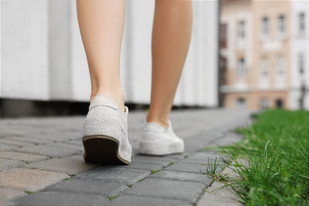 Woman in stylish sneakers walking on city street, closeup. Space for text