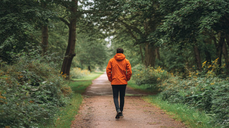 A person walks alone on a serene forest pathway wearing an orange jacket, surrounded by lush greenery and tall trees, embodying the essence of outdoor solitude.