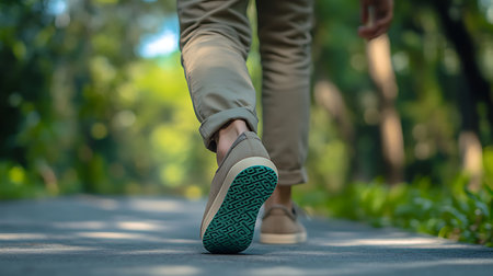 Captured from a low angle, this image features an unrecognized person walking on a paved path in khaki pants and shoes. The focus highlights the shoe's green sole.