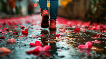 a person walking down a street with a bunch of red hearts on the ground next to a puddle of water. .