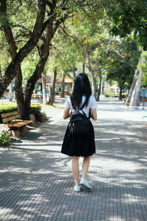Black long hair college girl in uniform walking on the pathway in the serene park, vertical.