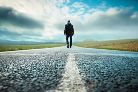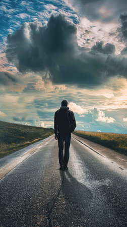 lonely man walking into the distance along an asphalt road among the landscape