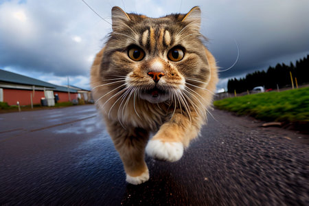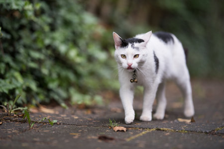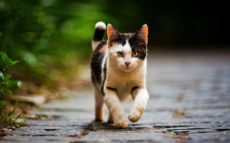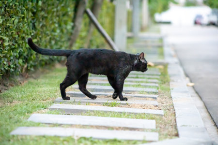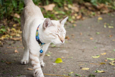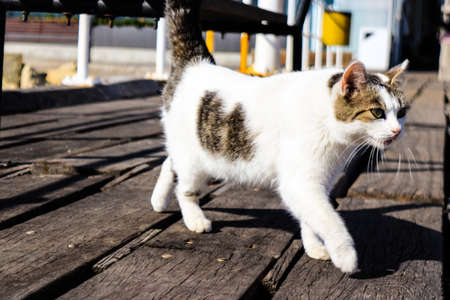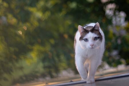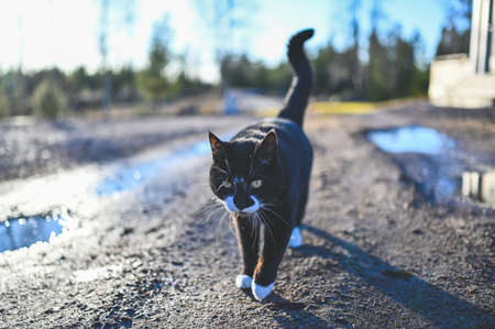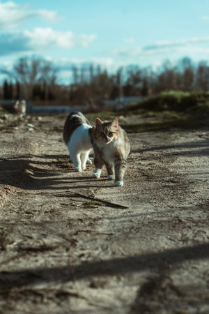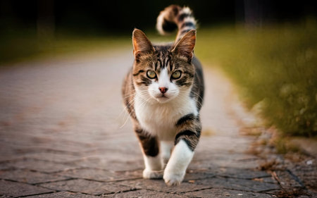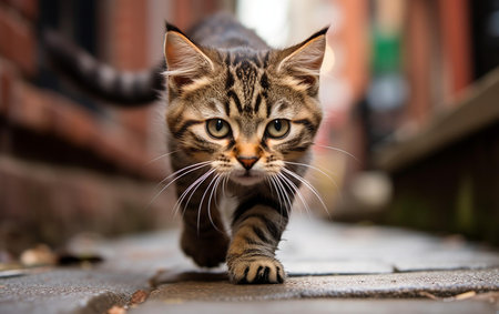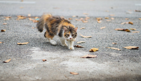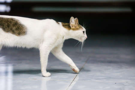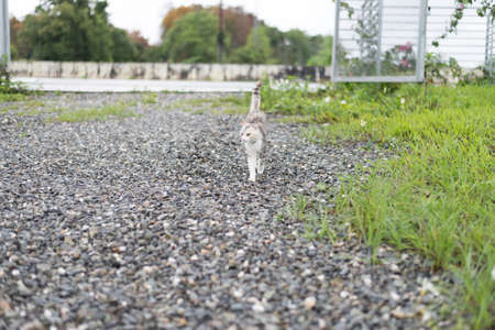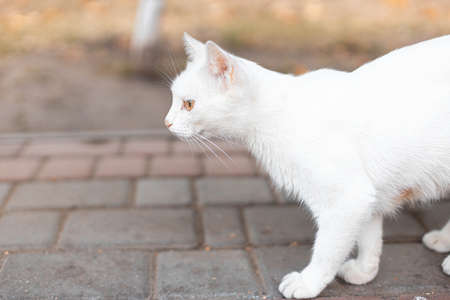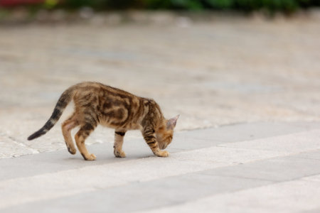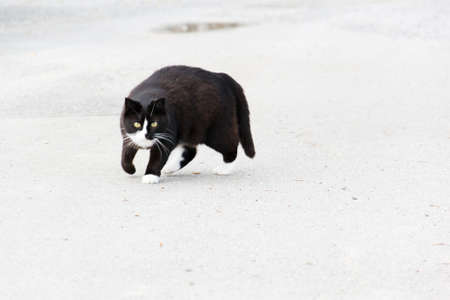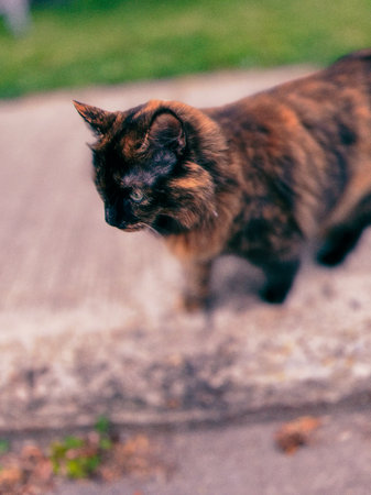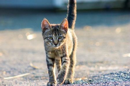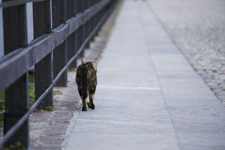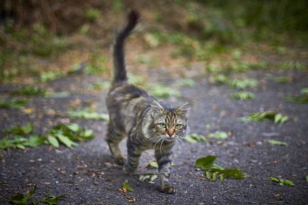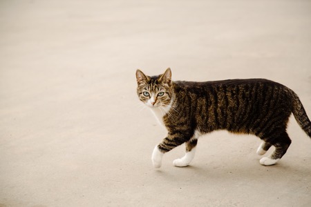 Cat walking on the street. Selective focus. Shallow depth of field.