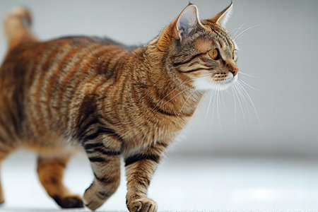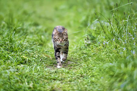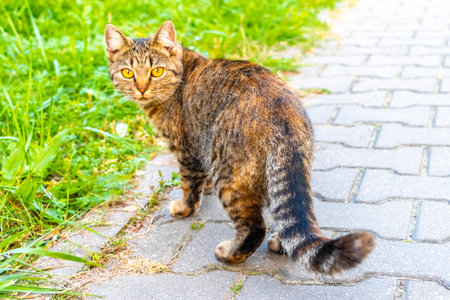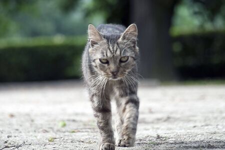 Gray cat with tiger stripes walking on the sidewalk at sunny day.