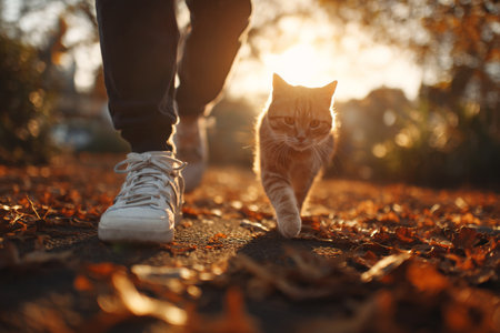A cute tabby beautiful cat sneaks along the ground strewn with fallen dry leaves on an autumn day. Pet walk in November. Nature.