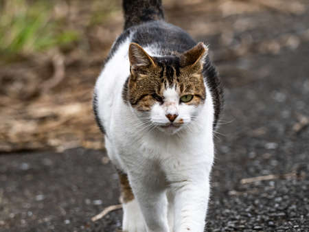 A portrait of a one eyed farm cat walking beside a field near Yokohama, Japan.