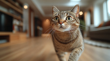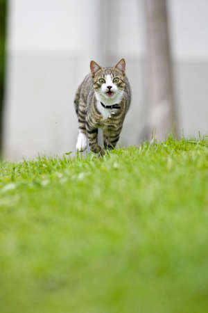 tabby british shorthair cat running towards camera in the back yard. the cat is looking directly at the camera