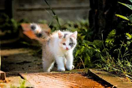 Cute stray kitten standing on a sidewalk in the Old Town of Kotor, Montenegro, Europe