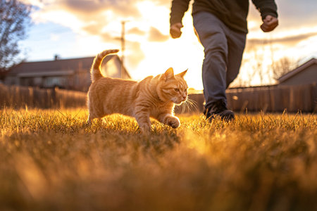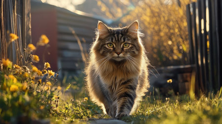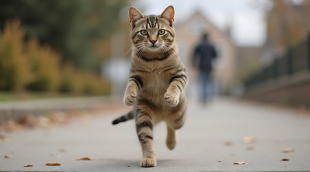 Gray Tabby Cat Racing Across Autumn Yard. Concept of feline agility, outdoor playtime, seasonal beauty, pet energy, fast running, motion.