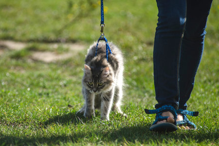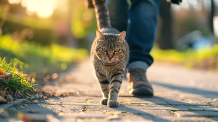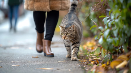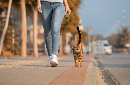 A Bengal cat on a leash walks next to a woman on the sidewalk. Walking with a domestic cat outdoors.