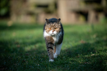 cute tabby white british shorthair cat looking walking towards camera on green grass with illuminated face by sunlight