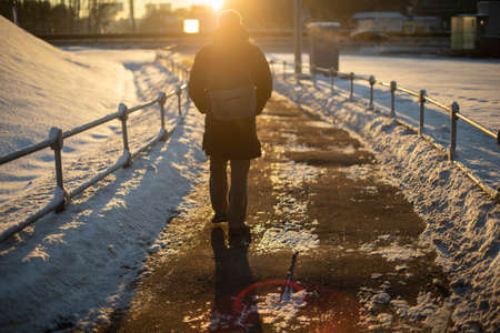 Man walks down road into sunset. Sun is setting. Pedestrian in winter. man in the sun. Glare from bright rays. Atmospheric photo.