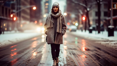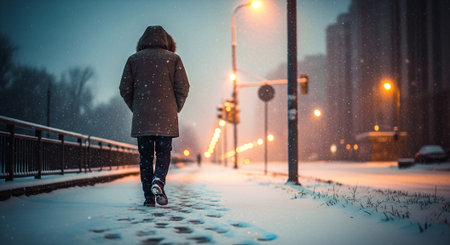 Woman walking on snowy road at night. Blurred background, bokeh.