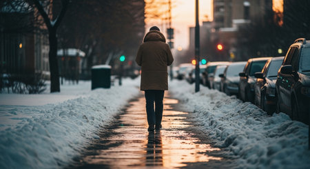 A person walking alone on a snowy sidewalk in a city during twilight, with buildings and streetlights in the background