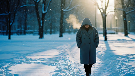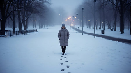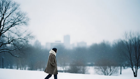 A solitary man walks through a snowy city park at dusk, bundled in a hooded winter coat. Soft snowfall settles on the branches and railings as the distant city skyline glows with warm, blurred lights. A moody, atmospheric winter scene perfect for themes of solitude, urban winter, mindfulness, seasonal change, mental health, and reflective moments in the city.