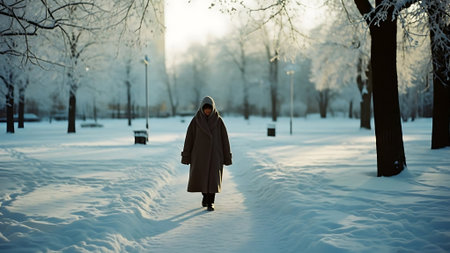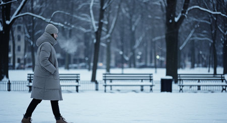 A woman walking in a snowy park during winter, holding a coffee cup, wearing a cozy coat and hat, with snowflakes falling around her