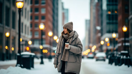 A young woman with a cup of hot coffee in her hands walks through the winter city.
