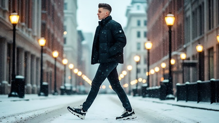Man in winter on street. Townsman on road. Road is in snow and man.