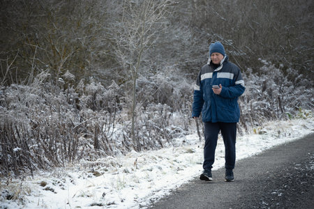 Winter walk. Adult man checking smartphone while walking outdoors in publick park. Concept of modern lifestyle, technology, communication and active senior age.