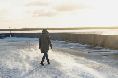 Back view woman in a winter jacket with a hood going on the embankment of a freezing river in winter. Blizzard.