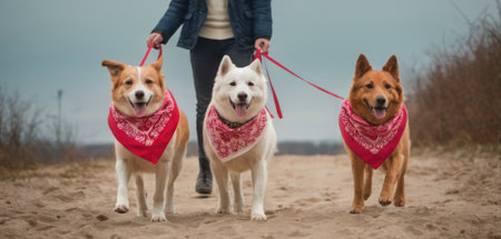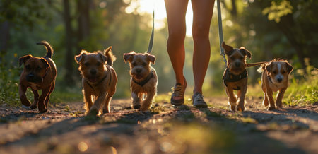 A lively scene of four dogs walking happily on leashes, showcasing different breeds. The sunny outdoor setting creates a joyful atmosphere, ideal for pet lovers.