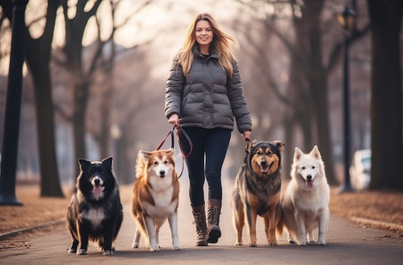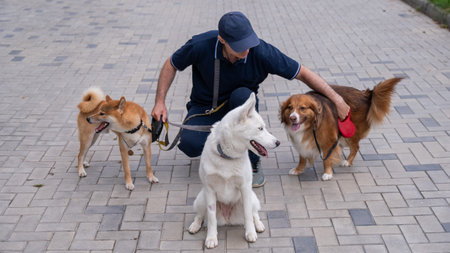 Professional dog walker leads various dogs on leashes through urban park. Concept Dog Walking, Urban Park, Professional Service, Leash Training, Canine Companions