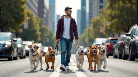 Young man confidently walks six dogs on city street, surrounded by urban traffic. The well-trained dogs move in sync, creating dynamic and stylish urban pet-walking scene full of energy. Dog sitter