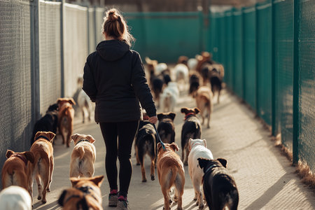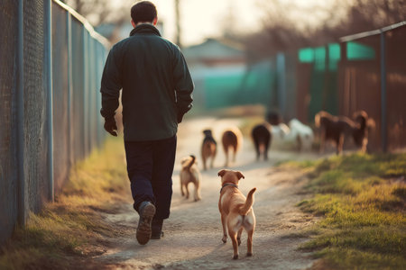 Volunteer walking a group of dogs at an animal shelter, enjoying the sunset along the fence, creating a moment of compassion and care