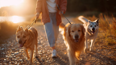 Walking three dogs along a sunlit path during golden hour
