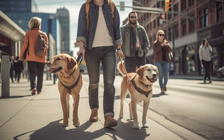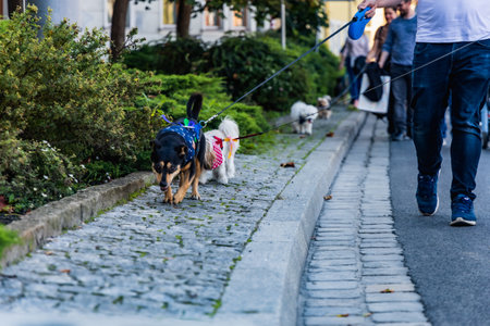 owners walking with their cute pets, joy of dog walking and urban pet care.