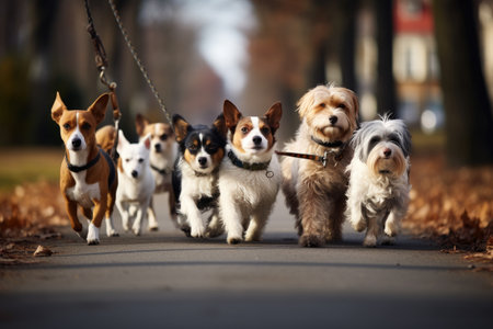 Group of Dogs Being Walked on Leashes by a Dog Walker AI