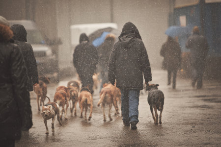 People walk shelter dogs through a rainy park as raindrops fall, creating a serene atmosphere in the late afternoon