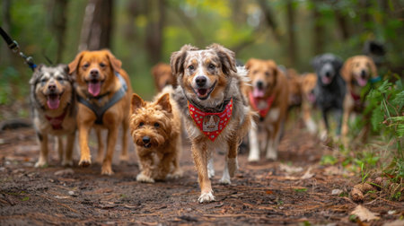 A group of dogs on a guided nature hike, wearing Canine Fitness Month bandanas, exploring forest trails as a way to encourage natural exercise and adventure.