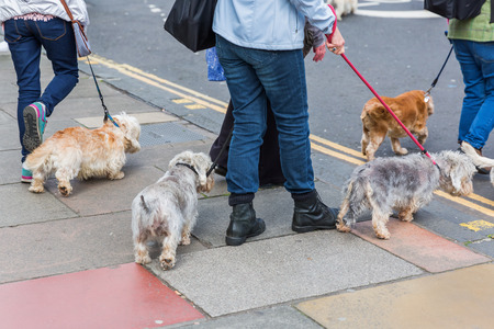 LONDON, ENGLAND - March 30, 2017 Man walking dogs on leashes