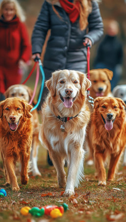 Various people walking their dogs outdoors, enjoying quality time and exercise together.