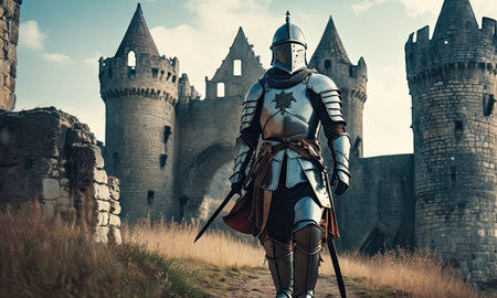A knight in shining armor stands before ancient castle ruins, surrounded by nature, a breathtaking blend of history and fantasy. Generated A.I.
