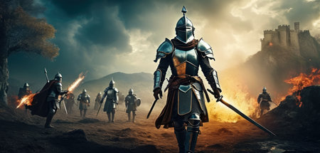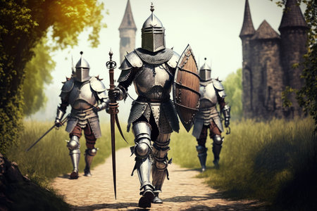 landscape with figures of medieval warriors in armor walking knight, created with generative ai