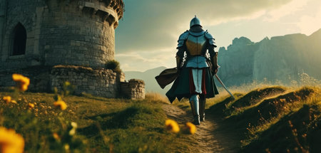 Armored medieval knight prepared for battle in front of majestic castle stronghold
