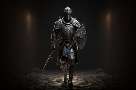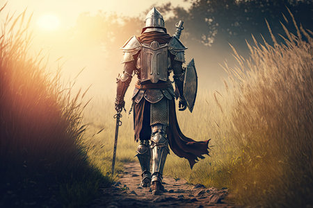 fantasy walking knight with shining armor and sword, created with generative ai