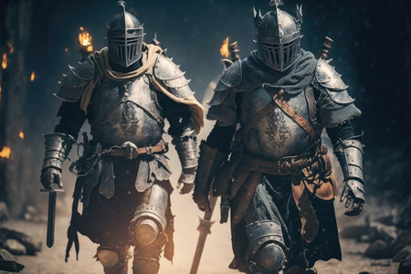 medieval warriors in armor going on way to fight walking knight, created with generative ai
