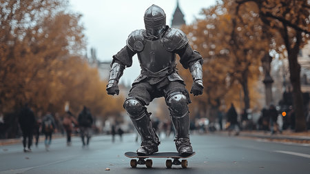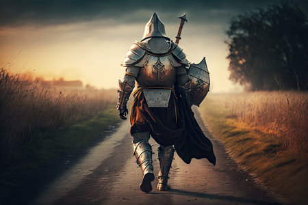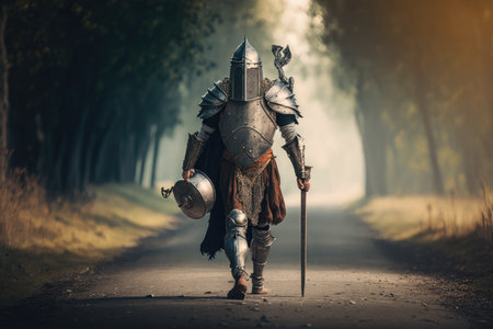 medieval warrior in armor and helmet walking on road, created with generative ai