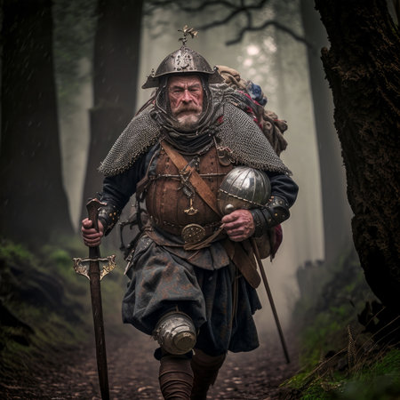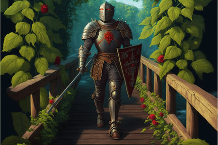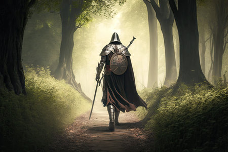 medieval fantasy story character in knight armor walking through woods, created with generative ai