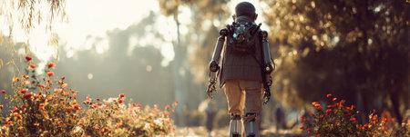 Disabled young man with prosthetic legs walking in the street, athlete man with prosthetic leg walking outdoor AI generated