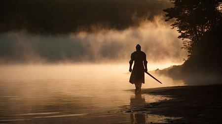 armored warrior in medieval armor walking into battle with sword, created with generative ai